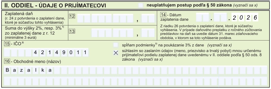 Zamestnanec: vyznačí venovanie u svojho zamestnávateľa do 15.2.2026 pri ročnom zúčtovaní a vo VYHLÁSENÍ uvedie tieto údaje o prijímateľovi. Termín zaslania vyhlásenia na DÚ do 30.4.2026